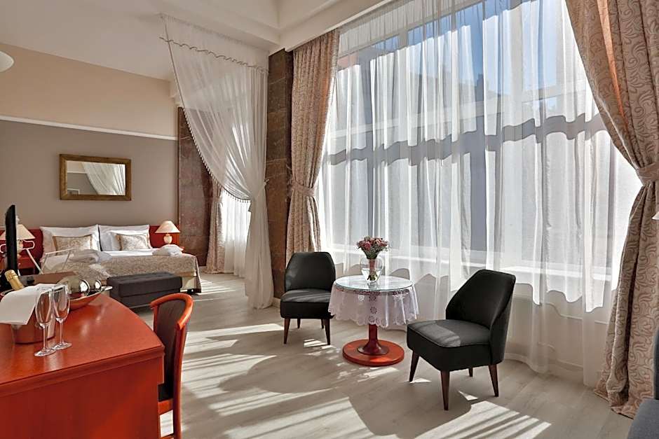 Elegantly equipped room with satellite TV, a mini-bar and a bathroom with a bathtub or a shower.